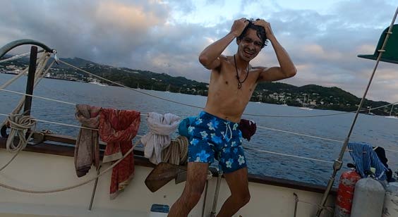 We anchored somewhere in the ocean and had a well-deserved lunch, followed up by a long cleanup session. That same day I had my first shower since I boarded the ship. However, it was NOT what I expected at all. There were people jumping in the ocean, climbing back on deck to clean themselves with soap (biodegradable), and then jumping in the ocean again. Finally, they would rinse themselves with no more than fifteen seconds of fresh water and call it a day.